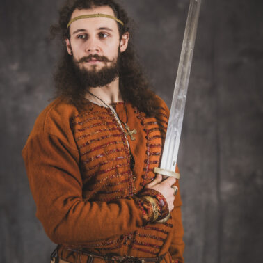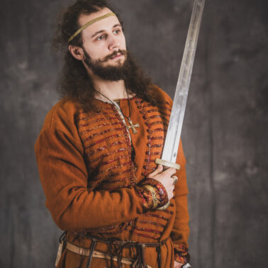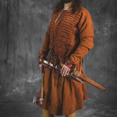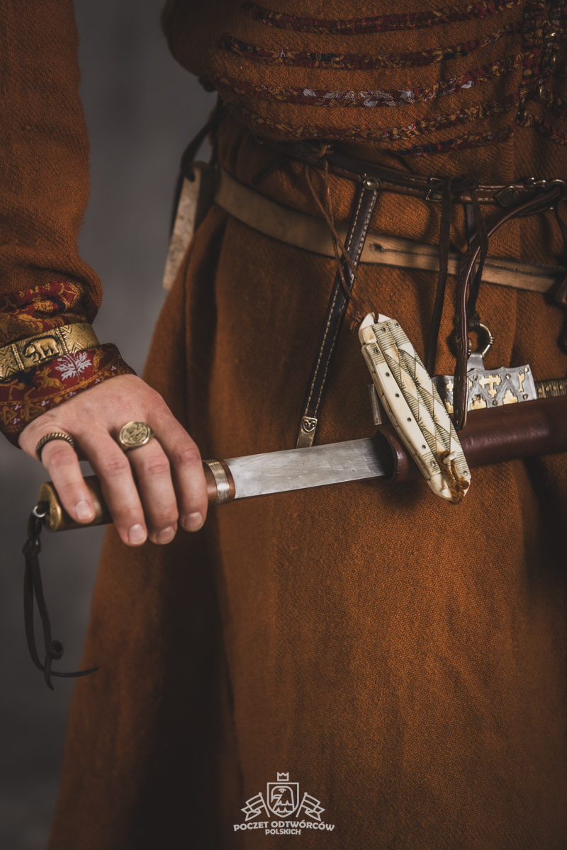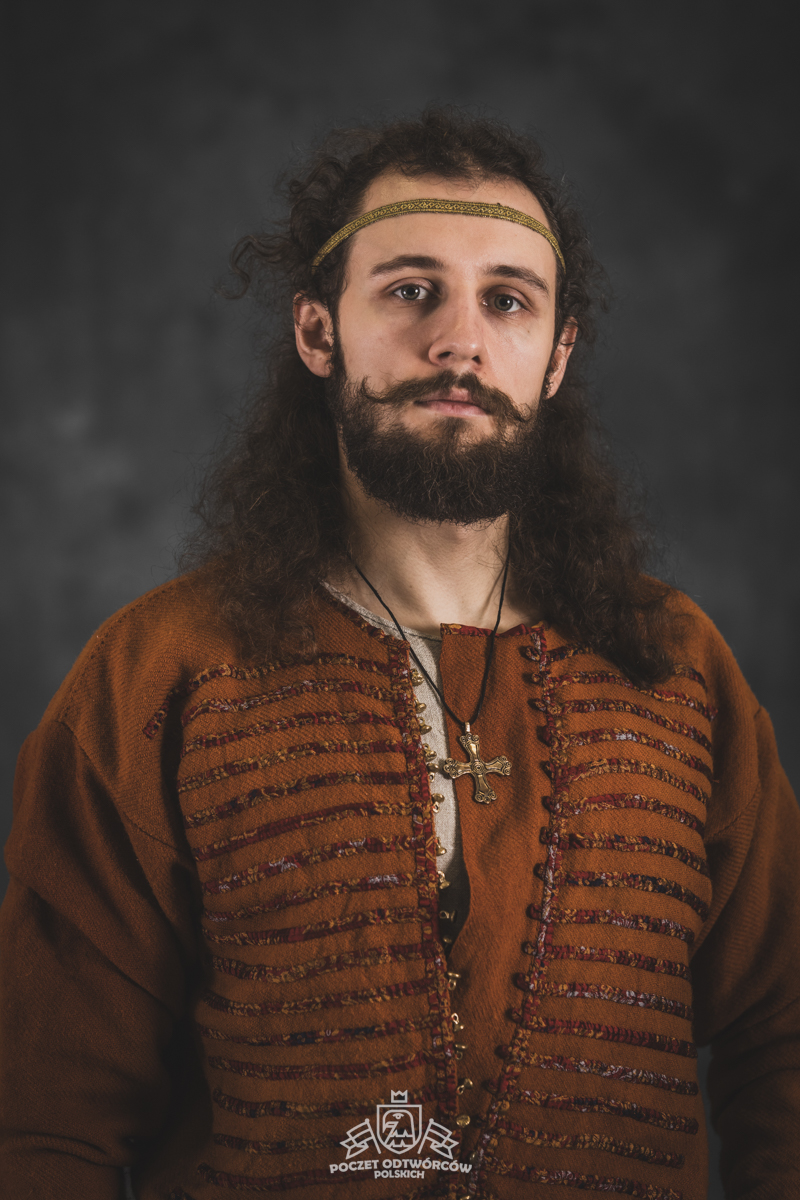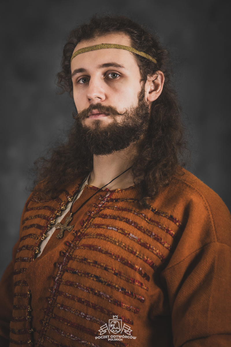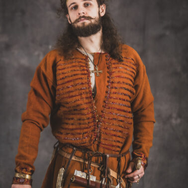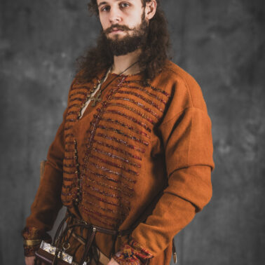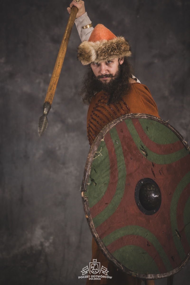 Farbowane na czarno skórzane trzewiki z podkutym obcasem, Na głowie filcowa czapka z wilczym futrem. Wełniana świta z jedwabną lamówką i razgaworami (szamerunki przy zapięciach) z jedwabiu z Bahram Guhr inspirowany znaleziskami stroju z Pskowa. Krajka z zielonego jedwabiu i złotej nici na podstawie znaleziska z pochówku nr. 5 z Szestowicy. Krzyż na szyi wzorowany na znaleziskach z Kijowa, Podhorców i Pskowa. Pas, grzebień i guzy na podstawie znalezisk z pochówka nr 42 w Szestowicy. Skramasaks, jak również pierścienie ze zwijanego brązowego drutu wykonany na podstawie znalezisk z tego samego grodu. Wełniane żółte nogawice z zielonymi sznurkami w charakterze podwiązek. Buty odwzorowują znalezisko z centrum Kijowa. W dłoni toporek w formie spotykanej na terenach całej Rusi. Miecz, również wykonany wraz z pochwą i trzewikiem na podstawie znaleziska z kurhanu nr. 42, jest typowym orężem kultury skandynawskiej z trzewikiem przedstawiającym Odyna i kruki na czubku pochwy.