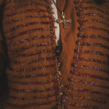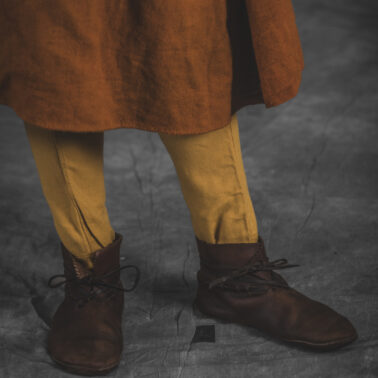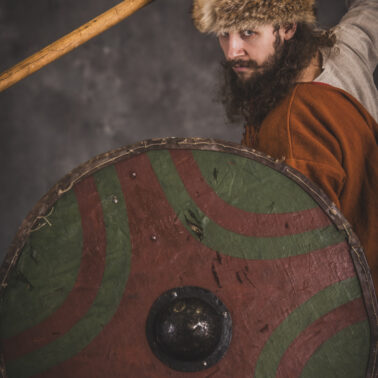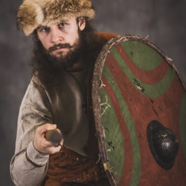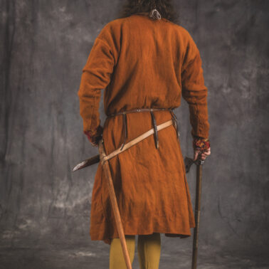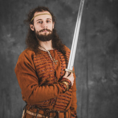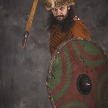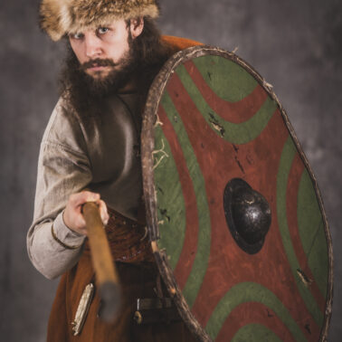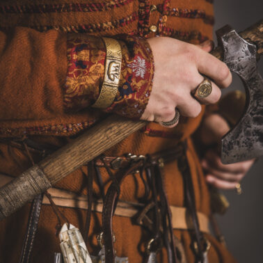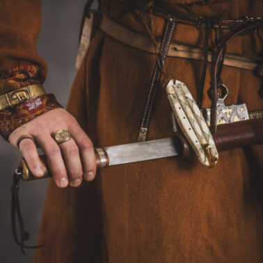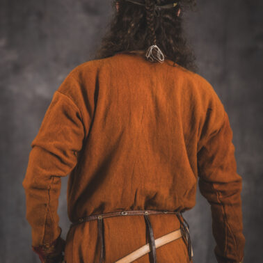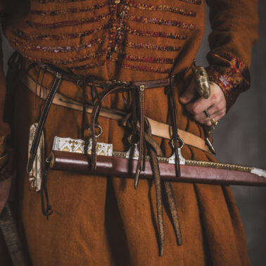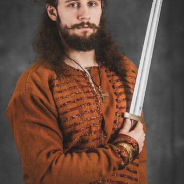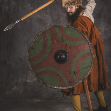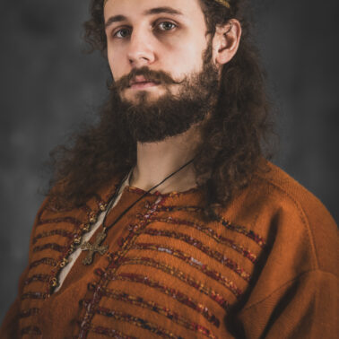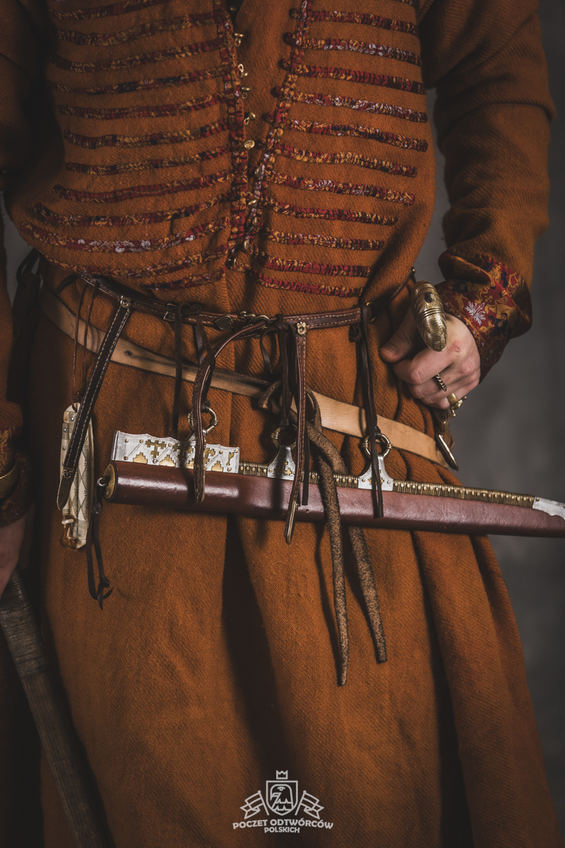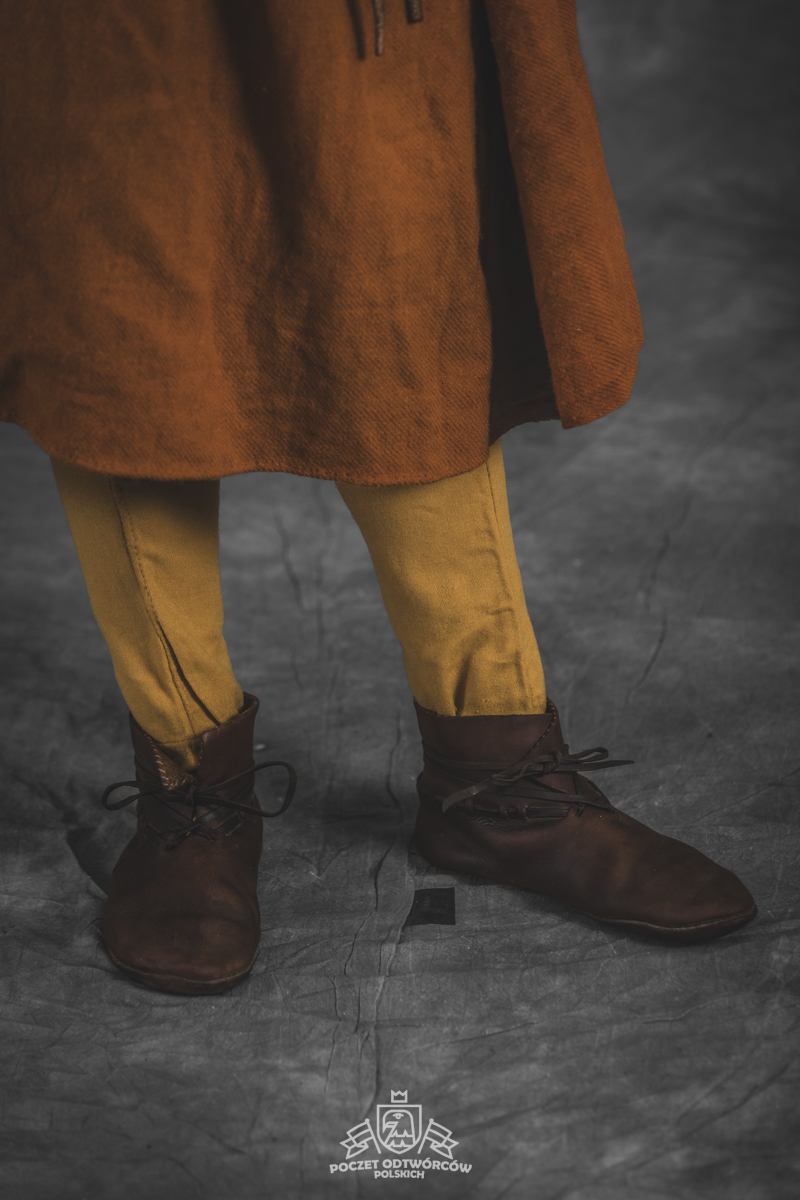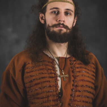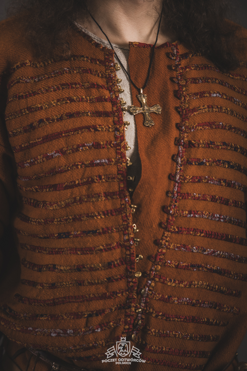 Farbowane na czarno skórzane trzewiki z podkutym obcasem, Na głowie filcowa czapka z wilczym futrem. Wełniana świta z jedwabną lamówką i razgaworami (szamerunki przy zapięciach) z jedwabiu z Bahram Guhr inspirowany znaleziskami stroju z Pskowa. Krajka z zielonego jedwabiu i złotej nici na podstawie znaleziska z pochówku nr. 5 z Szestowicy. Krzyż na szyi wzorowany na znaleziskach z Kijowa, Podhorców i Pskowa. Pas, grzebień i guzy na podstawie znalezisk z pochówka nr 42 w Szestowicy. Skramasaks, jak również pierścienie ze zwijanego brązowego drutu wykonany na podstawie znalezisk z tego samego grodu. Wełniane żółte nogawice z zielonymi sznurkami w charakterze podwiązek. Buty odwzorowują znalezisko z centrum Kijowa. W dłoni toporek w formie spotykanej na terenach całej Rusi. Miecz, również wykonany wraz z pochwą i trzewikiem na podstawie znaleziska z kurhanu nr. 42, jest typowym orężem kultury skandynawskiej z trzewikiem przedstawiającym Odyna i kruki na czubku pochwy.