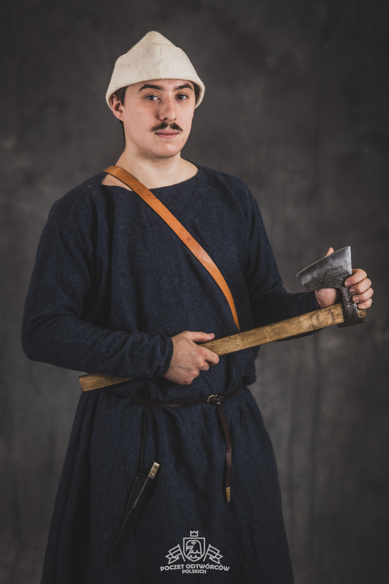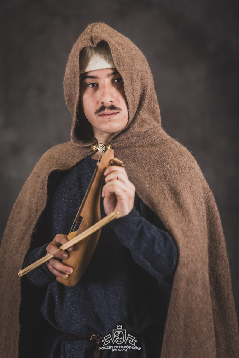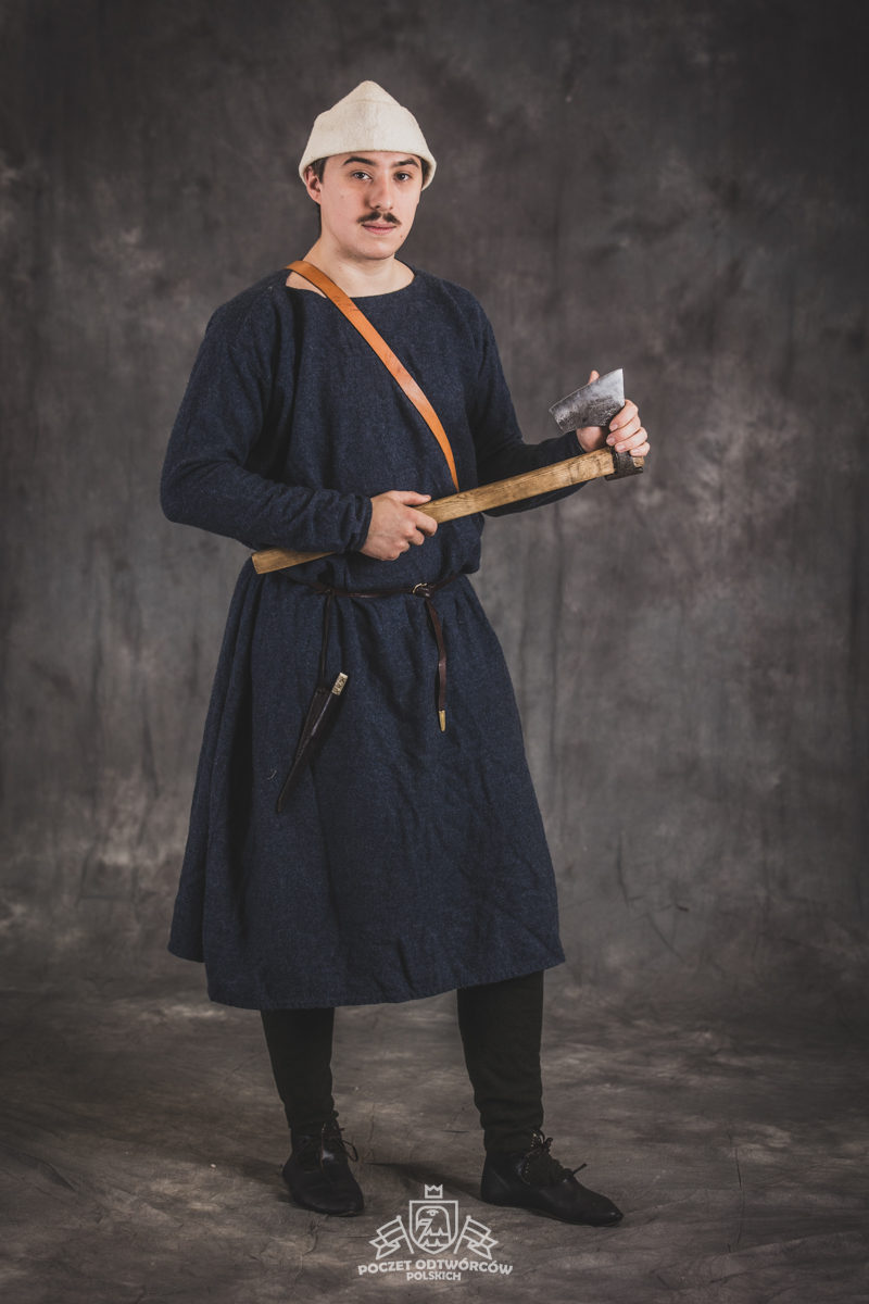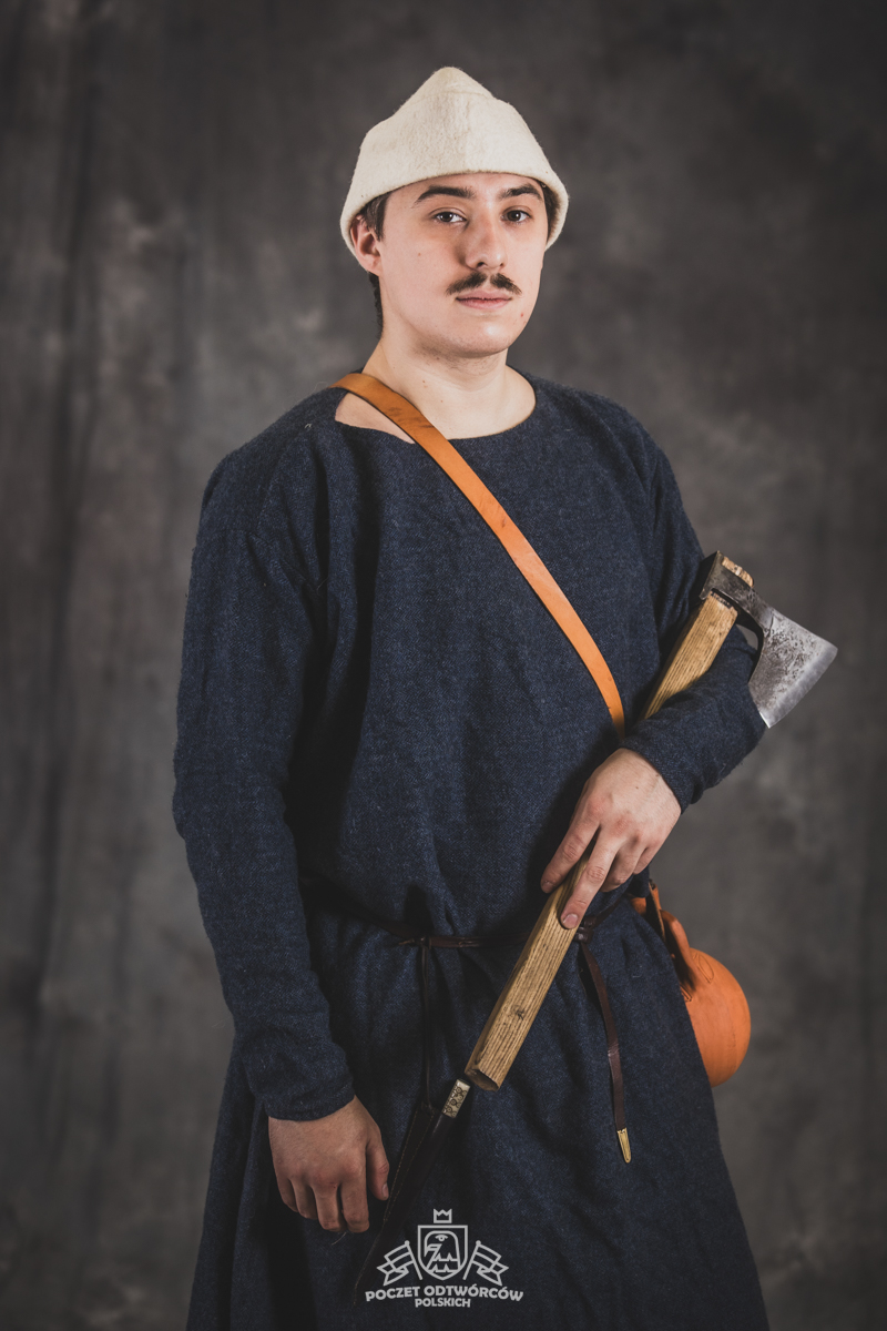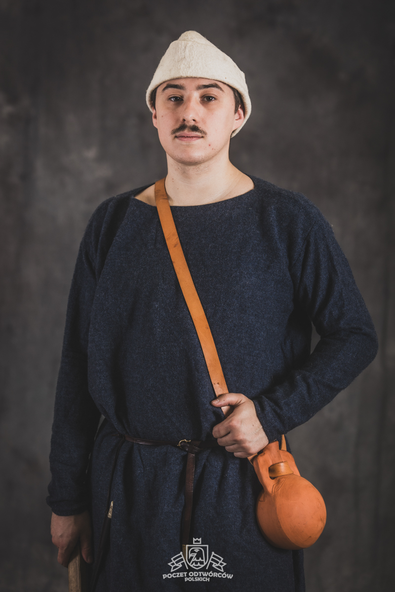 Na głowie prosta filcowa czapka pilleus ponnicus , na ramionach wełniany płaszcz z filcowanej wełny podobny w kroju do antyczno Rzymskich płaszczy „sagum”. Niebieska wełniana tunika w kroju tunik dziecięcych z „V&A museum” przepasana prostym paskiem z końcówką i sprzączkąz Efezu , wisi na nim prosty nożyk plakietkowy z kościną rękojeścią w „pawie oczka” . Na nogach zielone wełniane nogawice i krótkie buty dzangia. Kolorystyka całej sylwetki oparta na ikonografii z Monologium Bazyla II. Gliniana manierka wzorowana na znalezisku z Koryntu z oczami. Siekiera na podstawie żeleźca z wraku statku „serce limanii” i skrzypce wzorowane na przedstawieniach z plakietek kościanych z bizantyjskimi muzykami.