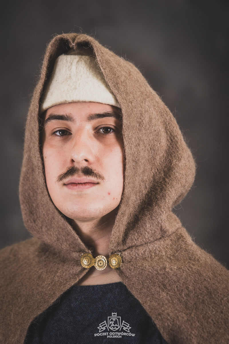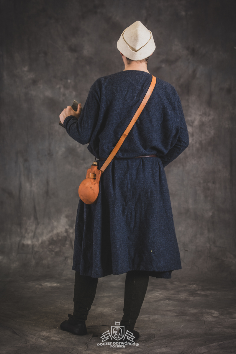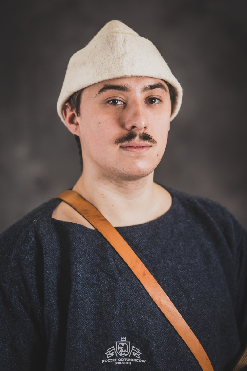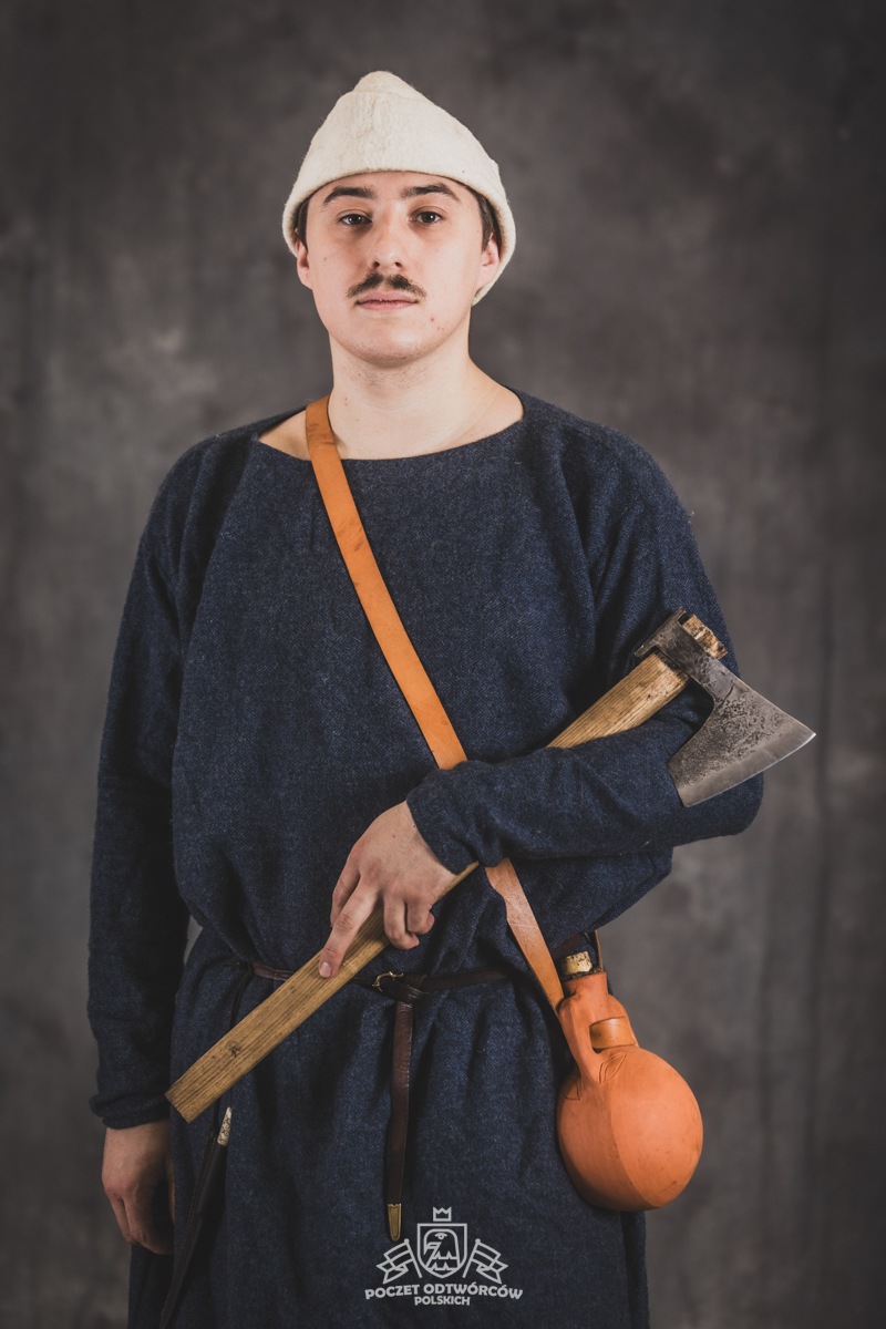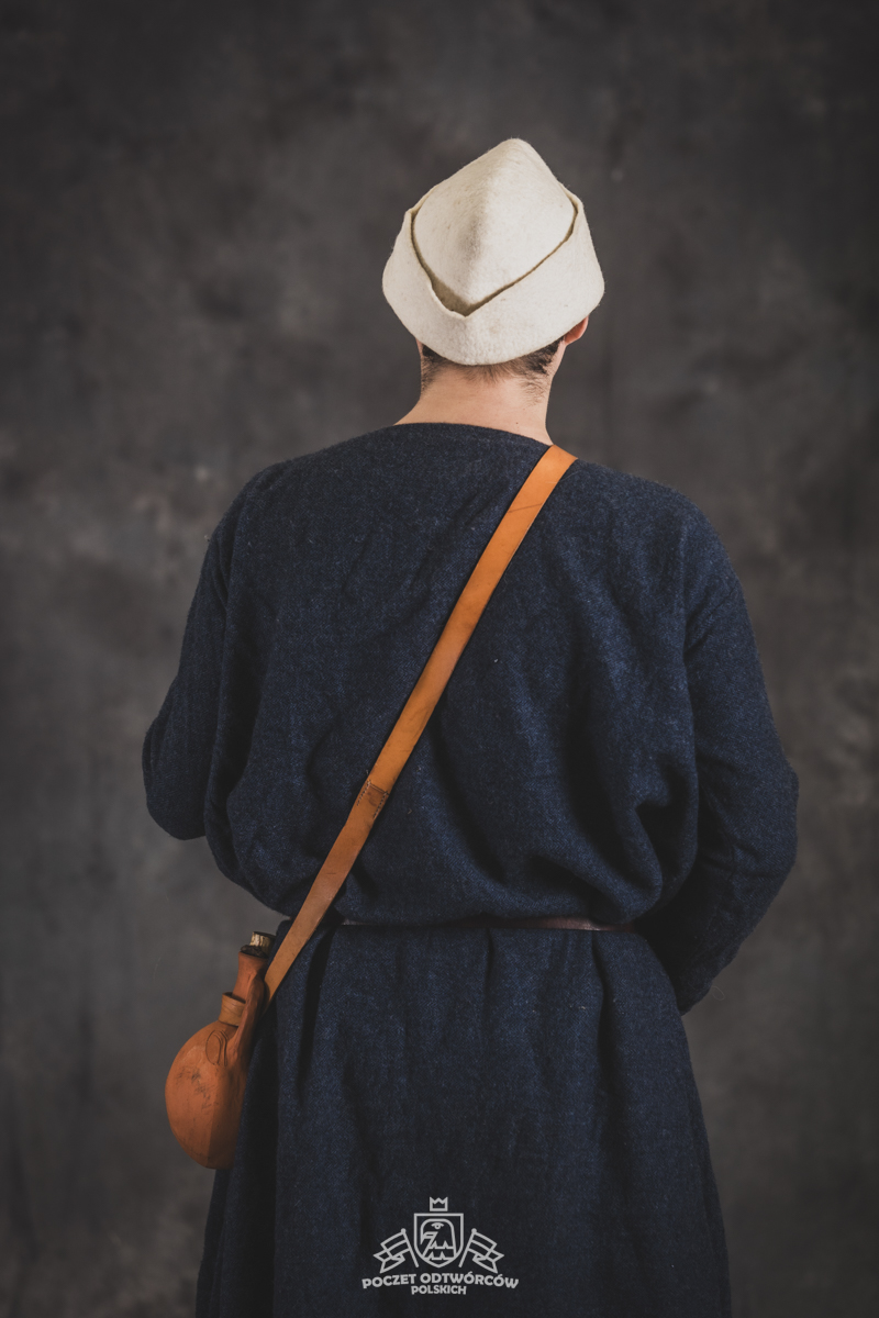 Na głowie prosta filcowa czapka pilleus ponnicus , na ramionach wełniany płaszcz z filcowanej wełny podobny w kroju do antyczno Rzymskich płaszczy „sagum”. Niebieska wełniana tunika w kroju tunik dziecięcych z „V&A museum” przepasana prostym paskiem z końcówką i sprzączkąz Efezu , wisi na nim prosty nożyk plakietkowy z kościną rękojeścią w „pawie oczka” . Na nogach zielone wełniane nogawice i krótkie buty dzangia. Kolorystyka całej sylwetki oparta na ikonografii z Monologium Bazyla II. Gliniana manierka wzorowana na znalezisku z Koryntu z oczami. Siekiera na podstawie żeleźca z wraku statku „serce limanii” i skrzypce wzorowane na przedstawieniach z plakietek kościanych z bizantyjskimi muzykami.