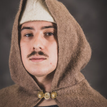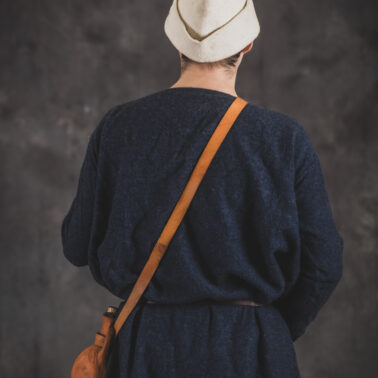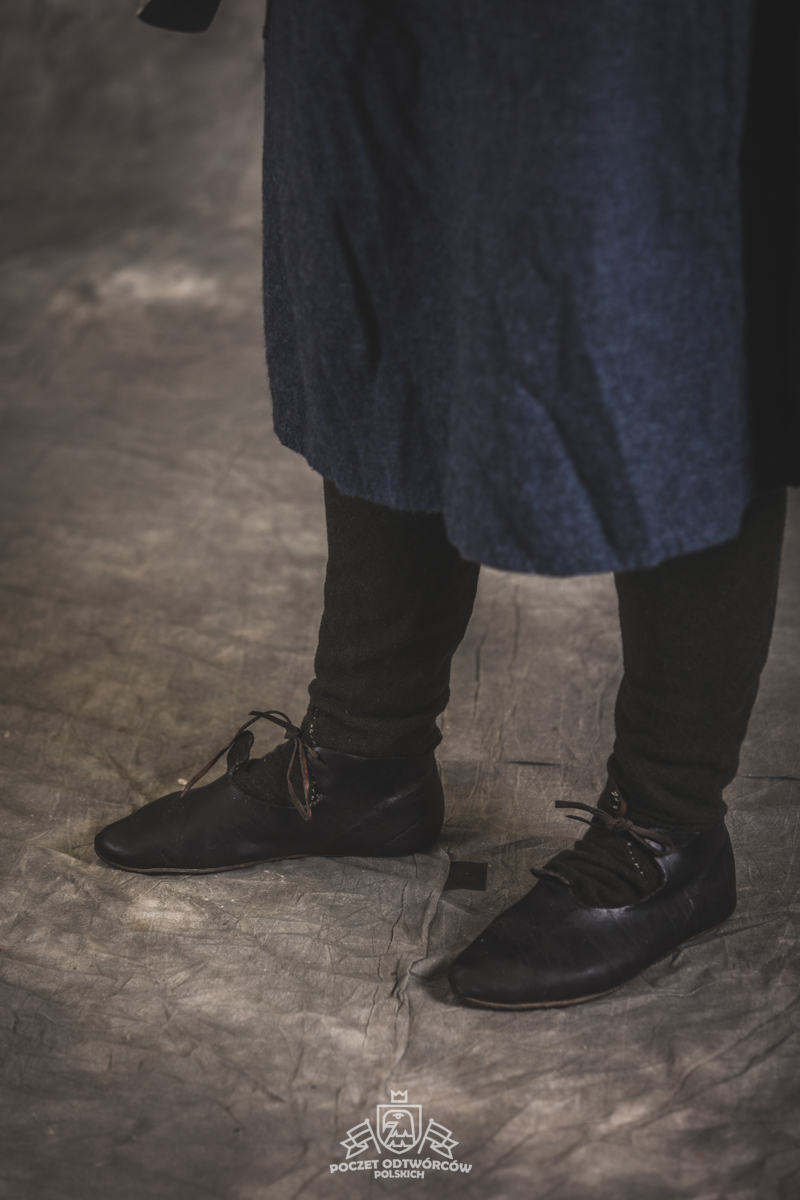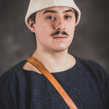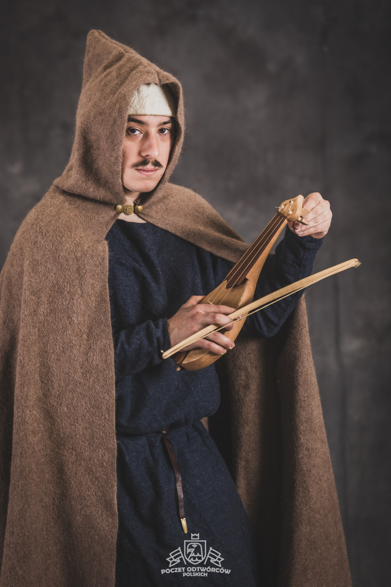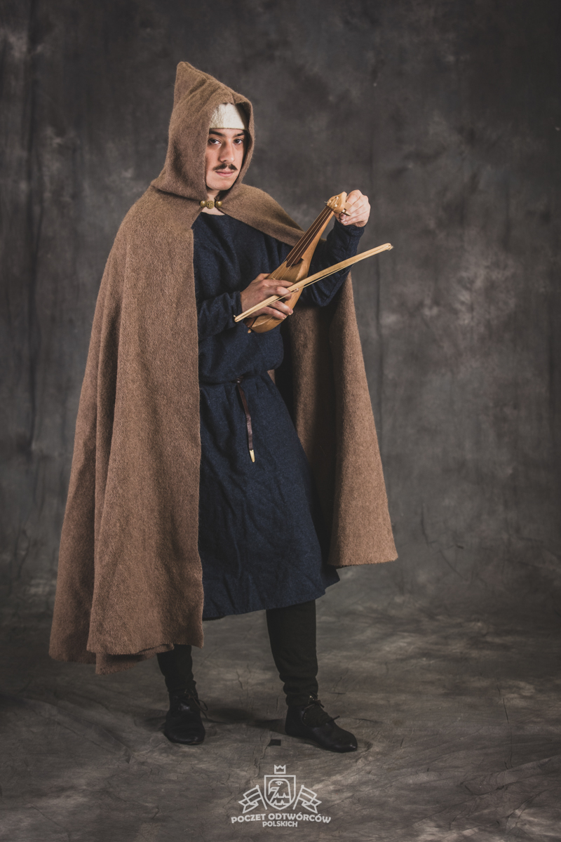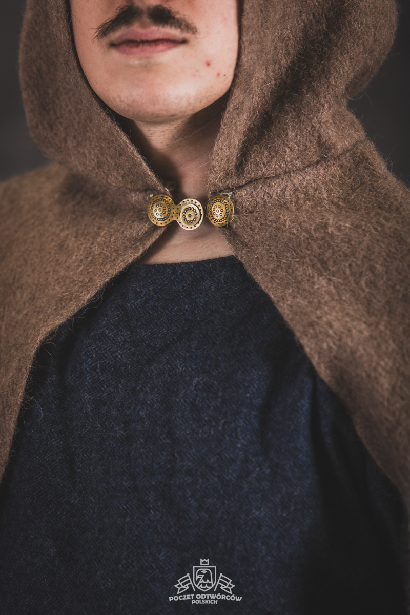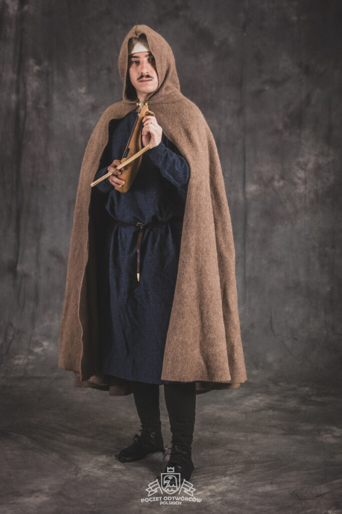 Na głowie prosta filcowa czapka pilleus ponnicus , na ramionach wełniany płaszcz z filcowanej wełny podobny w kroju do antyczno Rzymskich płaszczy „sagum”. Niebieska wełniana tunika w kroju tunik dziecięcych z „V&A museum” przepasana prostym paskiem z końcówką i sprzączkąz Efezu , wisi na nim prosty nożyk plakietkowy z kościną rękojeścią w „pawie oczka” . Na nogach zielone wełniane nogawice i krótkie buty dzangia. Kolorystyka całej sylwetki oparta na ikonografii z Monologium Bazyla II. Gliniana manierka wzorowana na znalezisku z Koryntu z oczami. Siekiera na podstawie żeleźca z wraku statku „serce limanii” i skrzypce wzorowane na przedstawieniach z plakietek kościanych z bizantyjskimi muzykami.