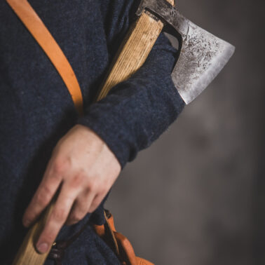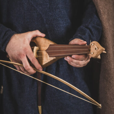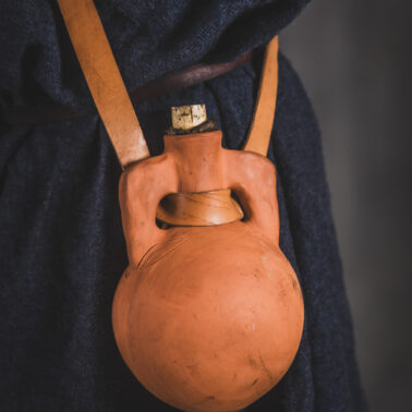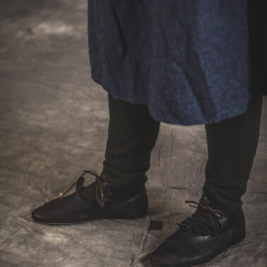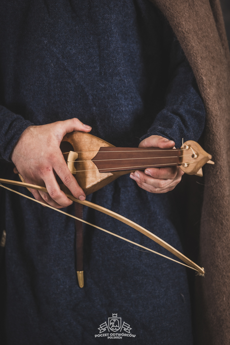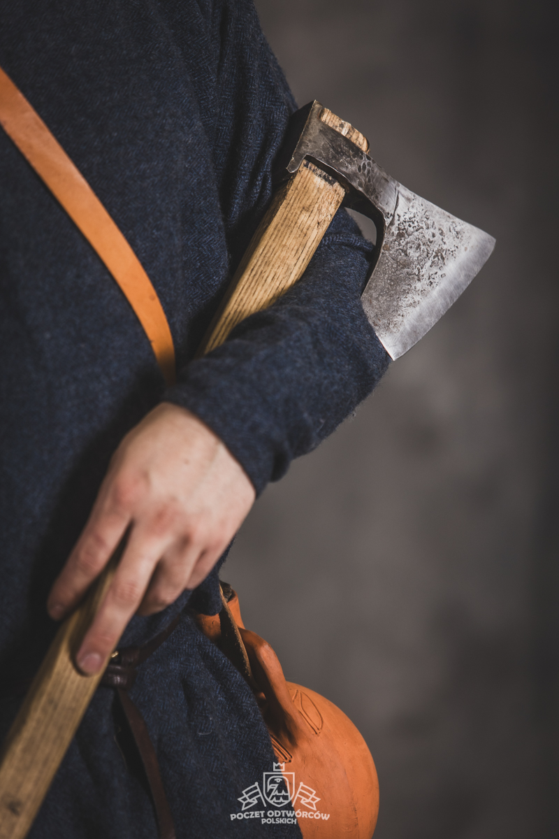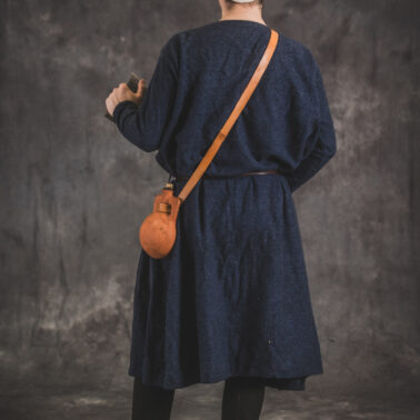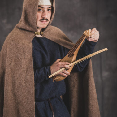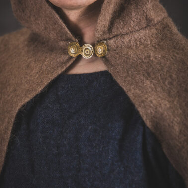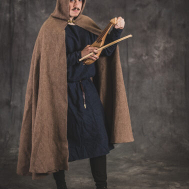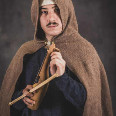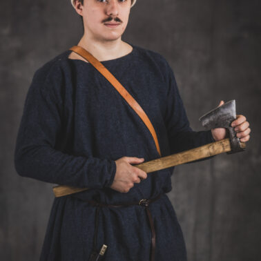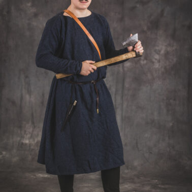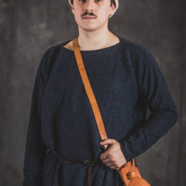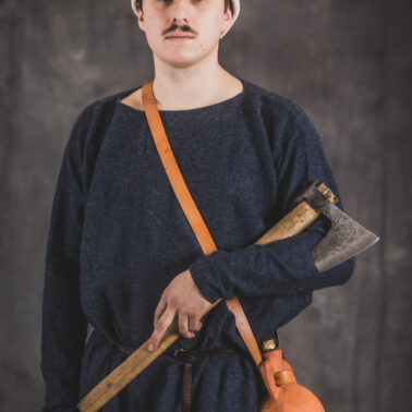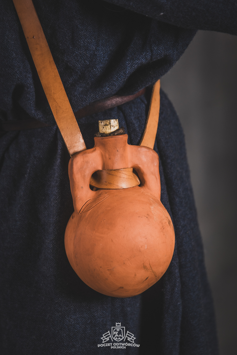 Na głowie prosta filcowa czapka pilleus ponnicus , na ramionach wełniany płaszcz z filcowanej wełny podobny w kroju do antyczno Rzymskich płaszczy „sagum”. Niebieska wełniana tunika w kroju tunik dziecięcych z „V&A museum” przepasana prostym paskiem z końcówką i sprzączkąz Efezu , wisi na nim prosty nożyk plakietkowy z kościną rękojeścią w „pawie oczka” . Na nogach zielone wełniane nogawice i krótkie buty dzangia. Kolorystyka całej sylwetki oparta na ikonografii z Monologium Bazyla II. Gliniana manierka wzorowana na znalezisku z Koryntu z oczami. Siekiera na podstawie żeleźca z wraku statku „serce limanii” i skrzypce wzorowane na przedstawieniach z plakietek kościanych z bizantyjskimi muzykami.