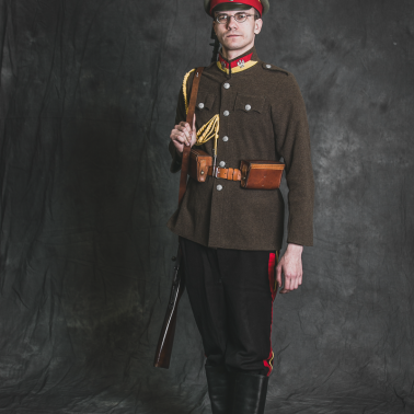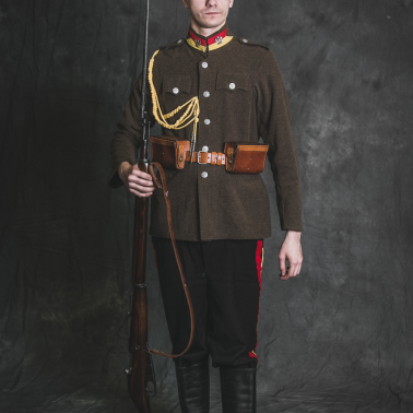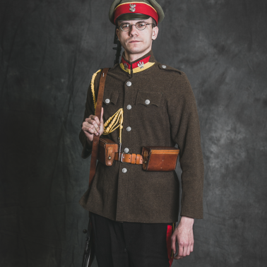 Sylwetka oparta na podstawie rysunków, opisu i zdjęć mundurów I Korpusu Polskiego w Rosji dowodzonego przez gen. Józefa Dowbor-Muśnickiego. Na głowie żandarma znajduje się okrągła czapka z czerwonym otokiem, żółtą wypustką. Orzełek to jedna z wersji występująca u Dowborczyków. Mundur – frencz w wersji żołnierskiej z czerwono-żółtymi proporczykami – to barwy żandarmerii) w które wpięte były orły. Z prawego naramiennika zwisa żółty sznur – jeden z wyróżników Straży Polowej. Mundur obszyty został charakterystycznymi guzikami dedykowanymi dla I Korpusu Polskiego. Granatowe spodnie z czerwonymi lampasami z żółtą wypustką. Na nogach buty długie typu rosyjskiego. Na pasie jednobolcowym żandarm nosi ładownice wz.1909 na amunicję do karabinu Mosin wz.1891 wraz z bagnetem, który jest uzbrojeniem.