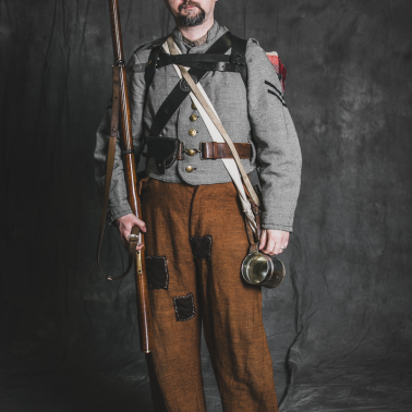 Buty typu Brogan z naturalnej, nie barwionej skóry. Spodnie cywilne typu „Uszy muła” z charakterystycznymi kieszeniami w kolorze butternut. Kurtka mundurowa typu Richmond Depot II z dystynkcjami kaprala (NCO). Cywilna kamizelka oraz koszula. Na głowie czapka typu kepi. Na innym ujęciu płaszcz wojskowy w kolorze szarym z różnymi guzikami uzupełnianymi w miarę potrzeby. Pas główny w stylu brytyjskim, ładownica z pasem piersiowym na którym widnieje tzw. „blacha stanowa” z godłem Luizjany, na pasie także kapiszonownik. Chlebak płócienny, manierka i kubek blaszany, nitowany. Na plecach tornister armijny ze zrolowanym cywilnym kocem. Karabin kapiszonowy Enfield model z 1853 r. Pierwszy Sztandar 14th Louisiana Infantry Regiments pozornie utracony pod Gettysburgiem. W rzeczywistości przechowany przez jednego z żołnierzy i odzyskany po wojnie.