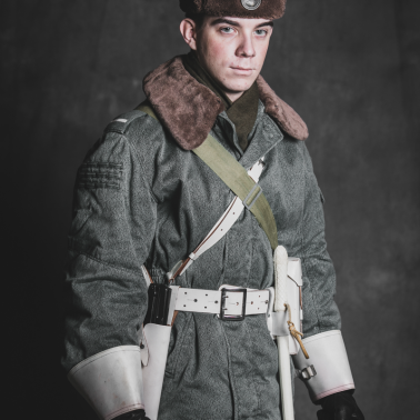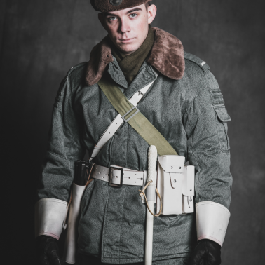 Czapka zimowa w kolorze brązowym dla Wojsk Lądowych z orłem metalowym bez korony WL, umundurowanie polowe wz.5637 w kamuflażu wz.68 MORO w odcieniu zielonym dla WL + kurtka zimowa zwana „bechatką” + szalokominiarka brązowa, ocieplacz zimowy, czyli dres w kolorze zielonym, trzewiki z opinaczem w kolorze brązowym dla WL/gumofilce, rękawice skórzane zimowe 5 palczaste z białym mankietem, skórzane białe: pas w kroju oficerskim, kabura, ładownica, pas nośny do pm wz.1963, oczko do pałki, maska MUA „Słoń” w szarej torbie, pistolet maszynowy wz.1963 „Rak” kal. 9×18 Makarow + 4 magazynki (1×15 naboi, 3×25 naboi) + przybory do czyszczenia broni, pałka gumowa biała, krótka tzw. „banan”.